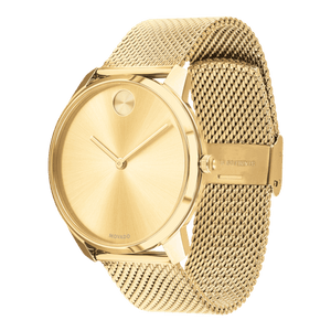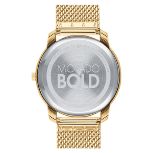 Yellow gold ion-plated stainless steel case with a yellow gold ion-plated stainless steel mesh bracelet. Fixed yellow gold ion-plated bezel. Gold dial with yellow gold-tone hands. No markers. The Movado dot appears at the 12 o'clock position. Dial Type: Analog. Quartz movement. Scratch resistant K1 crystal. Pull / push crown. Solid case back. Round case shape. Case size: 42 mm. Case thickness: 6.7 mm. Band width: 21 mm. Slide through clasp. Water resistant at 30 meters / 100 feet. Functions: hour, minute. Casual watch style. Watch label: Swiss Made. Movado Bold Quartz Gold Dial Yellow Gold Ion-plated Men's Watch 3600588.