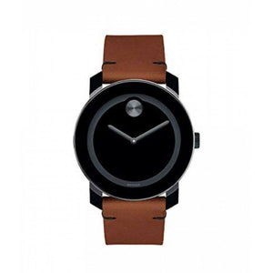 Black TR90 composite case with a brown leather strap. Fixed black TR90 composie bezel. Black dial with silver-tone hands. No markers. Movado dot appears at the 12 o'clock position. Dial Type: Analog. Quartz movement. Scratch resistant K1 mineral crystal. Pull / push crown. Solid case back. Round case shape. Case size: 42 mm. Case thickness: 10.5 mm. Band width: 22 mm. Tang clasp. Water resistant at 30 meters / 100 feet. Functions: hour, minute. Additional Info: two interchangeable leather straps. Bold Tr90 Series. Dress watch style. Watch label: Swiss Made. Movado BOLD TR90 Quartz Black Dial Men's Watch 3600600.