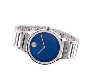 Stainless steel case with a stainless steel bracelet. Fixed stainless steel bezel. Blue dial with silver-tone hands. No markers. The Movado dot appears at the 12 o'clock position. Dial Type: Analog. Quartz movement. Scratch resistant sapphire crystal. Pull / push crown. Solid case back. Round case shape. Case size: 40 mm. Band width: 20 mm. Deployment with push button release clasp. Water resistant at 30 meters / 100 feet. Functions: hour, minute. Bold Series. Dress watch style. Watch label: Swiss Made. Movado Bold Quartz Blue Dial Stainless Steel Men's Watch 3600668.