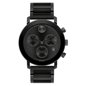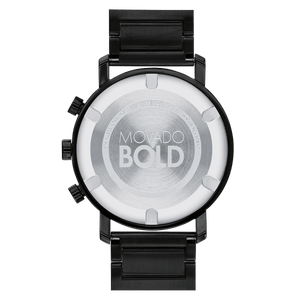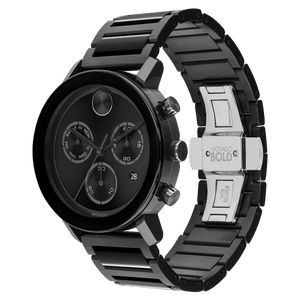 Black ion-plated stainless steel case and bracelet. Fixed black ion-plated bezel. Black dial with black hands and index hour markers. Movado dot appears at the 12 o'clock position. Dial Type: Analog. Date display at the 4 o'clock position. Chronograph - two sub-dials displaying: 60 second and 30 minute. Day of the week sub-dial. Quartz movement. Scratch resistant K1 crystal. Pull / push crown. Solid case back. Round case shape, case size: 42 mm. Band width: 22 mm. Fold over clasp with a push button release. Water resistant at 30 meters / 100 feet. Functions: chronograph, date, hour, minute, second. Bold Evolution Series. Casual watch style. Watch label: Swiss Made. Movado BOLD Evolution Chronograph Quartz Black Dial Men's Watch 3600684.