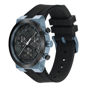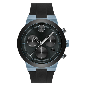 Blue ion-plated stainless steel case with a black silicone strap. Fixed black ceramic bezel. Black dial with black/silver hands and index hour markers. Minute markers. Movado dot appears atthe 12 o'clock position. Dial Type: Analog. Date display at the 4 o'clock position. Chronograph - two sub-dials displaying: 60 second and 30 minute. Day of the week sub-dial. Quartz movement. Scratch resistant K1 mineral crystal. Pull / push crown. Solid case back. Round case shape. Case size: 44 mm. Case thickness: 11 mm. Band width: 27 mm. Tang clasp. Water resistant at 30 meters / 100 feet. Functions: chronograph, date, hour, minute, second. Bold Fusion Series. Dress watch style. Movado Bold Fusion Chronograph Quartz Black Dial Men's Watch 3600713.