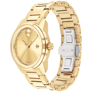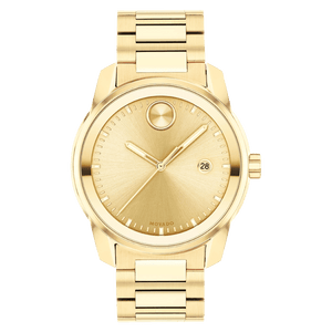 Movado BOLD Verso, 42 mm yellow gold ion-plated stainless steel case and bracelet with yellow gold metallization. Features a yellow gold-toned dial, Swiss Super-LumiNova accents, and date window detailing.Scratch Resistant K1 Mineral. Case size 42 mm. Water resistance upto 50 meters.