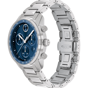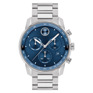 Movado BOLD Verso Chronograph, 44 mm stainless steel case and bracelet with tachymeter scale. Features a blue chronograph dial, Swiss Super-LumiNova accents, and date window detailing. Scratch Resistant K1 Mineral. Case size 44 mm. Water resistance upto 50 meters.
