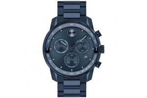 This Movado BOLD chronograph timepiece features a blue dial with 3 subdials, tachymeter scale and a date window. The watch includes a 44mm stainless steel case with stainless hands and printed accents. The watch is protected by a scratch-resistant K1 crystal and is powered by a Swiss quartz chronograph movement. The stainless steel bracelet is secured with a fold-over deployment clasp and is water resistant to 50 meters.