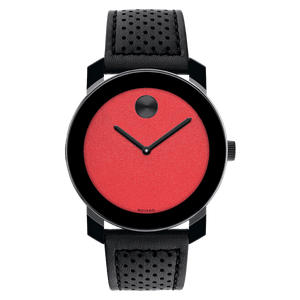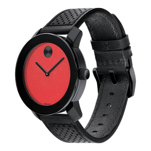 This vibrant Movado BOLD Evolution watch showcases a 42mm black ion-plated stainless steel case topped by a K1 crystal, and a bright red dial with black sunray dot and hands. The perforated black leather strap secures with a stainless steel buckle clasp. The watch features a Swiss quartz movement and is water-resistant to 30 meters.
