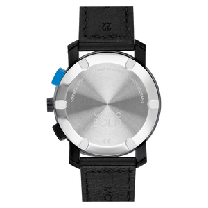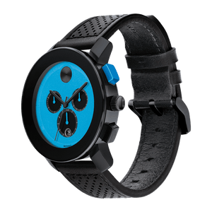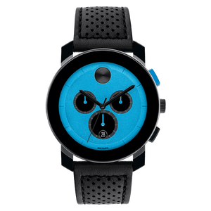 Movado BOLD TR90 Chronograph, 43.5mm Black TR90 composite material and stainless steel case, bright blue dial with black sunray dot and hands on a black perforated leather strap. Scratch Resistant K1 Mineral. Case size 43.5 mm. Water resistance upto 30 meters.