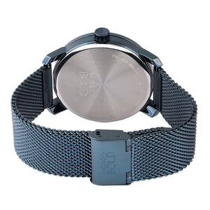 Blue PVD stainless steel case with a blue PVD stainless steel mesh bracelet. Fixed blue PVD stainless steel bezel. Grey dial with Arabic numeral hour markers. Dial Type: Analog. Quartz movement. Scratch resistant mineral crystal. Pull / push crown. Solid case back. Round case shape, case size: 41 mm. Fold over clasp. Water resistant at 30 meters / 100 feet. Functions: hour, minute, second. Bold Series. Casual watch style. Watch label: Swiss Made. Movado Bold Quartz Blue Dial Men's Watch 3600959.