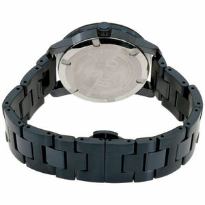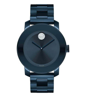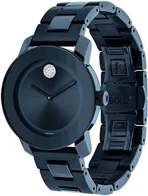 Blue ion-plated stainless steel case and bracelet. Fixed blue ion-plated bezel. Blue dial with blue hands. No markers. A crystal-set Movado dot appears at the 12 o'clock positions. Dial Type: Analog. Quartz movement. Scratch resistant K1 crystal. Pull / push crown. Solid case back. Case size: 36 mm. Case thickness: 9.2 mm. Round case shape. Band width: 18 mm. Fold over clasp with a push button release. Water resistant at 30 meters / 100 feet. Functions: hour, minute. Additional Info: in general, withstands splashes or brief immersion in water, but not suitable for swimming or bathing. Casual watch style. Movado Bold Blue Dial Ladies Watch 3600388.
