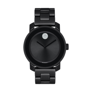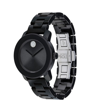Mid-size Movado BOLD watch, 36 mm black ceramic and stainless steel case, K1 crystal with a ring of highly reflective black-toned metallization, black dial with clear crystal-set dot and black-toned hands, black ceramic and stainless steel link bracelet with push-button deployment clasp. Water resistant to 30 meters. Quartz movement.