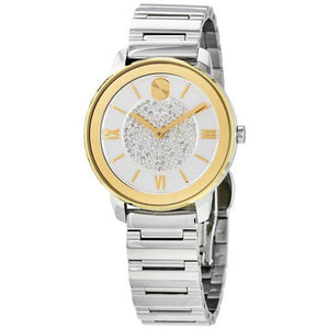 Stainless steel case with a stainless steel bracelet. Fixed gold-tone bezel. White crystal pave dial with gold-tone hands and index hour markers. Roman numerals appear at the 3, 6 and 9 o'clock positions. The Movado dot appears at the 12 o'clock position. Dial Type: Analog. Quartz movement. Scratch resistant K1 crystal. Pull / push crown. Solid case back. Round case shape. Case size: 32 mm. Case thickness: 10 mm. Band width: 18 mm. Butterfly clasp with a push button release. Water resistant at 30 meters / 100 feet. Functions: hour, minute. Bold Series. Dress watch style. Watch label: Swiss Movt. Movado Bold Quartz White Dial Ladies Watch 3600660.