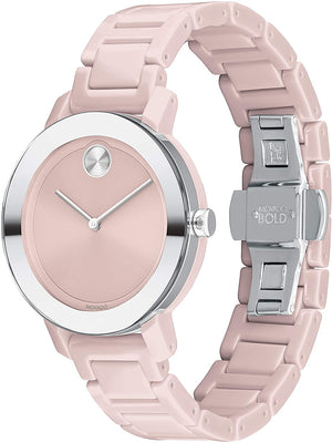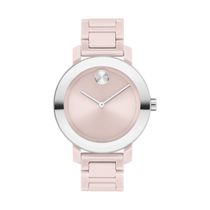 Movado BOLD Evolution, 36 mm blush ceramic and stainless steel case with blush ceramic link bracelet featuring a stainless steel bezel & blush-toned dial. Water resistant to 30 meters. Quartz movement.