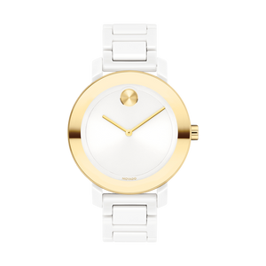 Movado BOLD Evolution, 36 mm white ceramic and light gold ion-plated stainless steel case with white ceramic link bracelet featuring a pale yellow gold ion-plated stainless steel bezel & white-toned dial. Water resistant to 30 meters. Quartz movement.