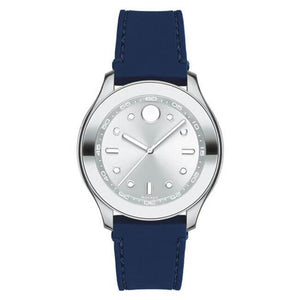Silver-tone stainless steel case with a blue silicone strap. Fixed silver-tone stainless steel bezel. Silver-tone metallic dial with luminous silver-tone hands and dot hour markers. Arabic numeral minute markers (at 5 minute intervals). Minute markers around the outer rim. Movado dot appears at the 12 o'clock position. Dial Type: Analog. Luminescent hands and markers. Quartz movement. Scratch resistant K1 mineral crystal. Pull / push crown. Solid case back. Round case shape, case size: 38 mm. Band width: 20 mm. Tang clasp. Water resistant at 30 meters / 100 feet. Functions: hour, minute, second. Bold Fusion Series. Casual watch style. Movado Bold Fusion Silver Metallic Dial Ladies Watch 3600716.