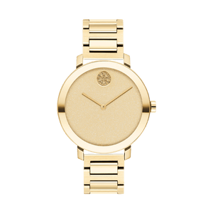 Movado Bold Evolution women's watch. Featuring a 34mm pale yellow gold-tone ion-plated stainless steel case and bracelet, the watch sparkles with a pale yellow gold-tone glitter dial and crystal pave dot. Swiss Quartz Movement ,Scratch Resistant K1 Mineral. Case size 34 mm. Water resistance upto 30 meters.