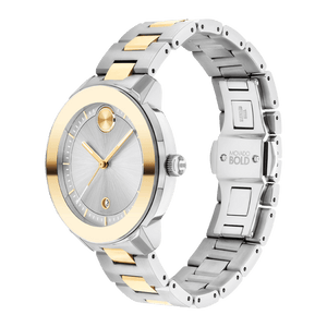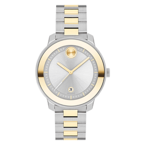 Movado BOLD Verso, Two-tone pale yellow gold ion-plated stainless steel case and bracelet with silver-toned dial. Features pale yellow gold accents, date window detailing, and minute track. K1 mineral crystal in a 38mm stainless steel case. Ensuring accuracy, the reliable Swiss quartz movement keeps you right on time. The two-tone, ionic-plated stainless steel link bracelet secures with a push-button deployment clasp and the watch is water-resistant to 30 meters.