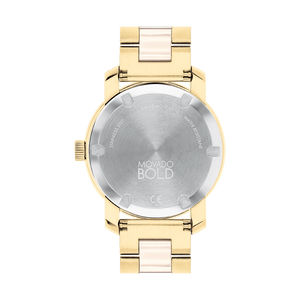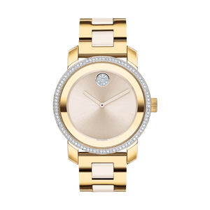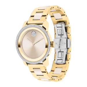 Movado BOLD Ceramic, 36mm pale yellow gold ion-plated stainless steel case and bracelet with taupe ceramic centerlinks and a taupe dial with a crystal pave dot and crystal set bezel. Scratch resistant K1 mineral. Swiss quartz movement. Case size 36.3 mm. Water resistance upto 30 meters.