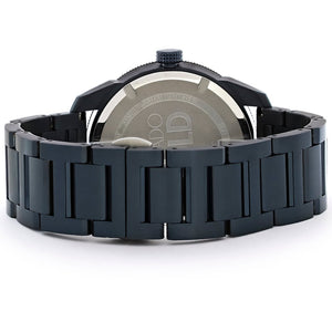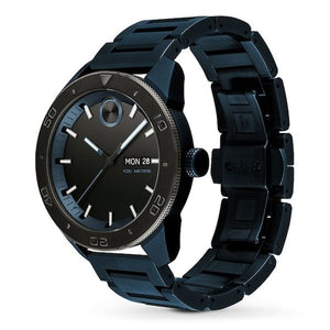 Blue ion-plated stainless steel case and bracelet. Fixed blue ion-plated bezel. Black / blue dial with luminous blue hands and index hour markers. Minute markers around the outer rim. The Movado dot appears at the 12 o'clock position. Dial Type: Analog. Day of the week and date display at the 3 o'clock position. Quartz movement. Scratch resistant K1 mineral crystal. Pull / push crown. Solid case back. Round case shape. Case size: 43.5 mm. Case thickness: 9 mm. Band width: 21 mm. Butterfly clasp. Water resistant at 100 meters / 330 feet.