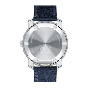 Movado trend 44.5mm stainless steel case with a silver dial on a navy leather strap. Quartz movement. Case size 45mm. Water resistance up to 30 meters. K1 mineral crystal. Buckle clasp.