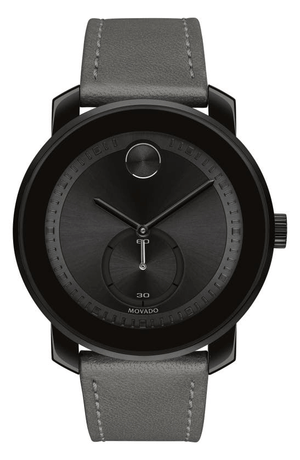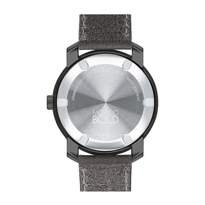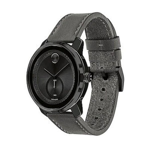 From the Movado Bold® Sport Collection, this men's watch features a black sunray dial with luminous black hands and markers, a black and silver-toned signature dot at the twelve o'clock hour, one sub-dial for day/date calendar indicator, with a polished bevelled edge bezel and mineral crystal in a 44.5mm black ion-plated stainless steel case. Ensuring accuracy, the reliable Swiss quartz movement keeps you right on time. The grey leather strap, with stitch detailing, secures with a buckle clasp. Water resistance upto 30 meters.