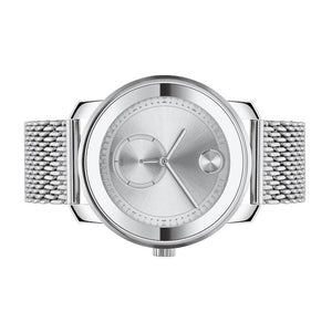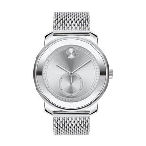 From the Movado Bold® Sport collection, this men's watch features a silver-toned dial and signature dot 12 o'clock marker and hands and K1 mineral crystal in a 44.5mm stainless steel case. The reliable Swiss quartz movement ensures accurate time keeping. The stainless steel mesh bracelet secures with a sliding buckle clasp. Water-resistant to 30 meters, this watch comes with a two-year limited manufacturer warranty. We are an authorized Movado Bold® dealer.