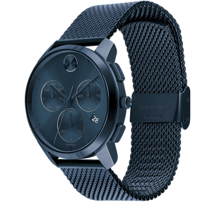 Blue ion-plated stainless steel case with a blue ion-plated stainless steel mesh bracelet. Fixed blue ion-plated bezel. Blue dial with luminous blue hands and index hour markers. The Movado dot appears at the 12 o'clock position. Dial Type: Analog. Luminescent hands. Date display at the 4 o'clock position. Chronograph - two sub-dials displaying: 60 second and 30 minute. Day of the week sub-dial. Quartz movement. Scratch resistant K1 mineral crystal. Pull / push crown. Solid case back. Round case shape. Case size: 42 mm. Case thickness: 10 mm. Band width: 20 mm. Fold over slip through clasp. Water resistant at 30 meters / 100 feet. Functions: chronograph, date, day of the week, hour, minute, second. Casual watch style. Watch label: Swiss Movt. Movado Bold Thin Chronograph Quartz Blue Dial Men's Watch 3600633.