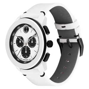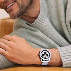 The BOLD TR90 is defined by a sporty, bold case created with our durable, lightweight TR90 material. This 43.5mm watch features a white dial, black subdials, and Swiss Super-LumiNova® accents.