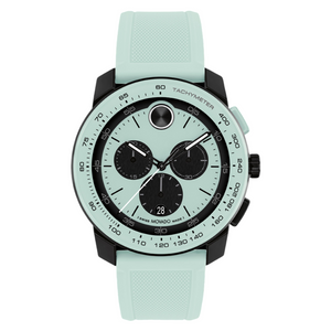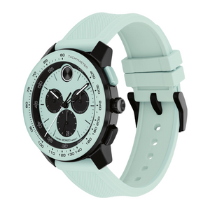 The BOLD TR90 is defined by a sporty, bold case created with our durable, lightweight TR90 material. This 42mm watch features a seafoam blue dial, black subdials, and Swiss Super-LumiNova accents. Black seafoam Tr90 composite material case with blue seafoam silicone strap. Pin buckle clasp. Quartz movement. Water resistance up to 30 meters. K1 mineral crysyal.