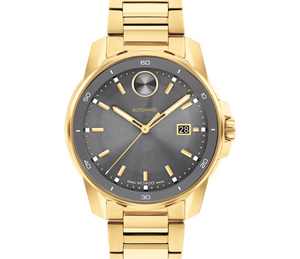The BOLD Verso is defined by a bold, sport-inspired case and sophisticated detailing. A Swiss made automatic movement drives this watch, powered by the motion of your wrist. This 43mm watch features a grey dial, Swiss Super-LumiNova accents, and our signature dot at 12 o'clock. Automatic watches do not contain batteries. They are charged by the movement of your wrist. If the watch is not worn it will stop running in about 38 hours. To get it started, turn the crown clockwise about 20-30 times until the second-hand starts moving. You will most likely need to reset the time and date.