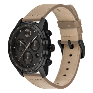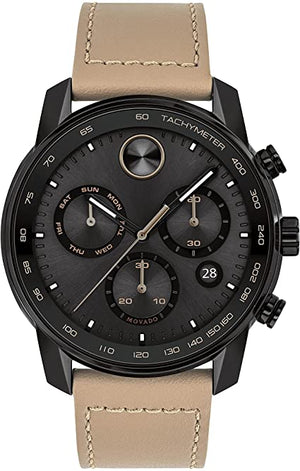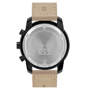 Movado BOLD Verso, 44mm black ion-plated stainless steel case. Features a black chronograph dial with Swiss Super-LumiNova® accents and date window detailing on a taupe leather strap. The watch is protected by a scratch-resistant K1 crystal and is powered by a Swiss quartz chronograph movement. The tan leather strap is secured with a buckle clasp and is water resistant to 50 meters.