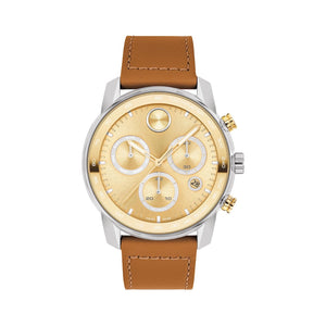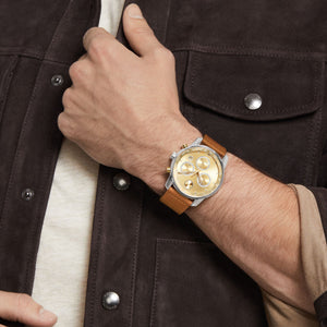 The sporty, eternally stylish chronograph gets a fresh feel with a strong, contemporary design that combines modern minimalism and a bold edge. The statement making 44mm case is cast in shimmering stainless steel for a flawlessly refined finish. The gleaming pale yellow gold ion plated chronograph dial features a date window and swiss super luminova accents framed by a tachymeter bezel with a luxurious camel leather strap. Quartz movement. Case size 44mm. Water resistant up to 50 meters. K1 mineral crystal. Buckle clasp.