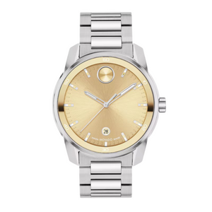 The BOLD Verso is defined by a bold, sport-inspired case and sophisticated detailing. This 42mm watch features a gold tone sunray dial, Swiss Super-LumiNova accents, and our signature dot at 12 o'clock. Stainless steel case and bracelet with deployment clasp. Water resistance up to 50 meters. K1 mineral crystal.