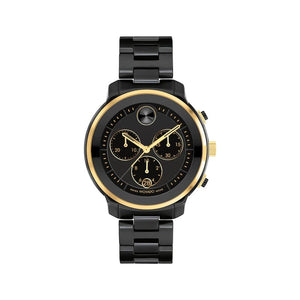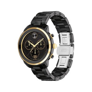 The sporty, eternally chic chronograph gets fresh feel with striking contemporary design that combines modern minimalism and a bold edge. The classic bracelet and statement making 39.5mm case are crafted from rich black ceramic for a flawlessly refined finish. The matching black chronograph dial features three subdials, a date window with pale yellow gold toned details and swiss super luminova accents. Black ceramic pale gold ionic plated stainless steel case and bracelet with black dial. Quartz movement. Water resistance up to 50 meters. Scratch resistant K1 mineral crystal. Push button deployment clasp.