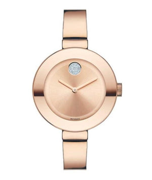 Rose gold PVD stainless steel case and bangle bracelet. Rose dial with rose gold-tone hands. No markers. Dial Type: Analog. Quartz movement. Scratch resistant K1 crystal. . Round case shape. Case size: 34 mm. Case thickness: 7 mm. Band width: 10 mm. Band length: 7 inches. Deployment clasp. Water resistant at 30 meters / 100 feet.