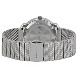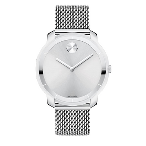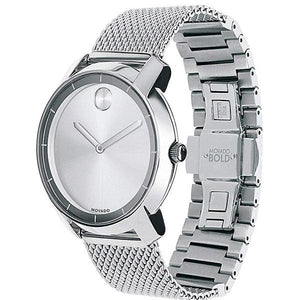 Stainless steel case with a stainless steel mesh bracelet. Fixed stainless steel bezel. Silver dial with silver-tone hands and index hour markers. The Movado dot appears at the 12 o'clock position. Dial Type: Analog. Quartz movement. Scratch resistant K1 crystal. Case diameter: 36 mm. Round case shape. Deployment clasp with a push button release. Water resistant at 30 meters / 100 feet.