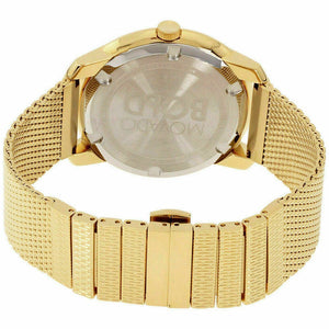 Yellow gold ion-plated stainless steel case with a yellow gold ion-plated stainless steel mesh bracelet. Gold dial with yellow gold-tone hands and index hour markers. No markers. The Movado dot appears at the 12 o'clock position. Dial Type: Analog. Quartz movement. Scratch resistant K1 crystal. Case size: 36 mm, case thickness: 8 mm. Round case shape. Band width: 17 mm. Deployment clasp with push button release. Water resistant at 30 meters / 100 feet.