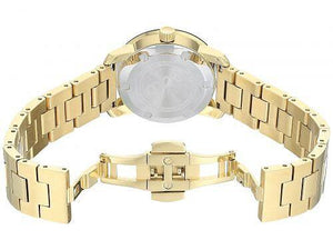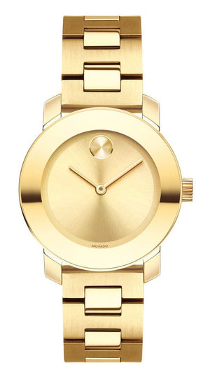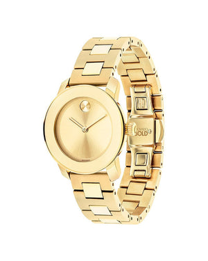 Smaller mid-size Movado BOLD watch, 30 mm yellow gold ion-plated stainless steel case, K1 crystal with a ring of highly reflective yellow gold-toned metallization, yellow gold-toned sunray dial with matching hands and sunray dot, yellow gold ion-plated stainless steel link bracelet with deployment clasp.