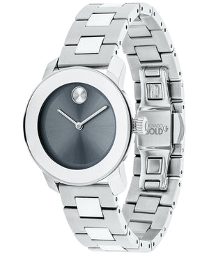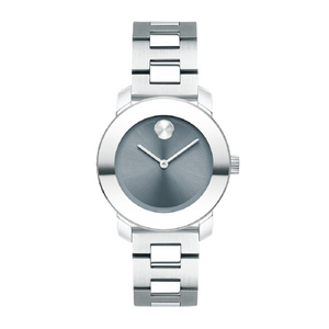 Silver-tone stainless steel case with a silver-tone stainless steel bracelet. Fixed silver-tone stainless steel bezel. Blue-steel sunray dial with silver-tone hands. Dial Type: Analog. Quartz movement. Scratch resistant k1 mineral crystal. Case size: 30 mm. Round case shape. Deployment clasp. Water resistant at 30 meters / 100 feet. Functions: hour, minute. Dress watch style. Movado Bold Blue Steel Dial Ladies Watch 3600436.