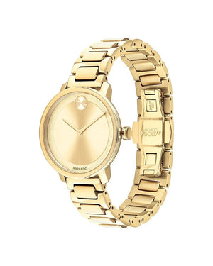 Mid-size Movado BOLD watch, 34 mm pale gold ion-plated stainless steel case, K1 crystal, pale gold-toned dial with matching frosted-textured outer ring, pale gold-toned dot and hands, pale gold ion-plated stainless steel link bracelet with push-button deployment clasp.