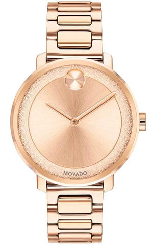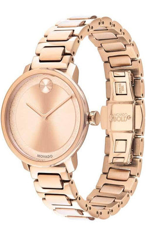 Rose gold PVD stainless steel case and bracelet. Rose dial with rose gold-tone hands. The Movado dot appears at the 12 o'clock position. Dial Type: Analog. Quartz movement. Scratch resistant K1 mineral crystal. Pull / push crown. Solid case back. Round case shape. Case size: 34 mm. Case thickness: 10 mm. Band width: 14 mm. Deployment clasp with a push button release. Water resistant at 30 meters / 100 feet.