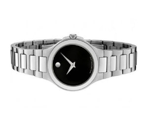 Stainless steel case with a stainless steel bracelet. Fixed stainless steel bezel. Black dial with silver-tone hands. No markers. The signature Movado Dot appears at the 12 o'clock position. Quartz movement. Scratch resistant sapphire crystal. Push / pull crown. Solid case back. Case diameter: 28 mm. Case thickness: 7 mm. Hidden fold over clasp. Water resistant at 30 meters/ 100 feet. Movado Corporate Exclusive Ladies Watch 0606164.