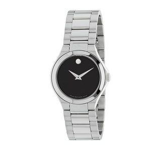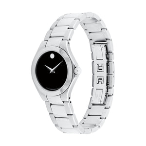 Stainless steel case with a stainless steel bracelet. Fixed stainless steel bezel. Black dial with silver-tone dauphine-style hands. No markers. The Movado dot appears at the 12 o'clock position. Dial Type: Analog. Quartz movement. Scratch resistant sapphire crystal. Pull / push crown. Solid case back. Round case shape. Case size: 28 mm. Case thickness: 6 mm. Band width: 14 mm. Hidden fold over clasp. Water resistant at 30 meters / 100 feet. Functions: hour, minute. Dress watch style. Watch label: Swiss Made. Movado Defio Quartz Black Dial Ladies Watch 0607308.