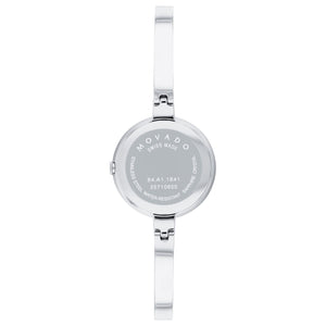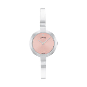 Minimalist elegance for the modern woman. Women's movado ela watch, 25 mm stainless steel case, pink soleil museum dial with silver toned dot and hands, slender stainless steel bangle style bracelet with back sizing links and jewelry clasp. Quartz movement. Case size 25 mm. Water resistance up to 30 meters. Sapphiare crystal.