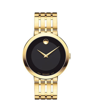 Yellow gold PVD stainless steel case and bracelet. Fixed yellow gold PVD bezel. Black dial with gold-tone hands. No markers. The Movado dot marks the 12 o'clock position. Dial Type: Analog. Quartz movement. Scratch resistant sapphire crystal. Pull / push crown. Solid case back. Case size: 39 mm. Case thickness: 4.63 mm. Round case shape. Band width: 22 mm. Deployment clasp with a push button release. Water resistant at 30 meters / 100 feet. Functions: hour, minute. Dress watch style. Watch label: Swiss Made. Movado Esperanza Black Dial Mens Watch 0607059.