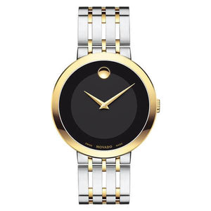Stainless steel case with a two-tone (silver and yellow gold PVD) stainless steel bracelet. Fixed yellow gold PVD bezel. Black museum dial with yellow gold-tone hands. No markers. The Movado dot marks the 12 o'clock position. Dial Type: Analog. Quartz movement. Scratch resistant K1 mineral crystal. Pull / push crown. Solid case back. Case size: 39 mm. Case thickness: 4.63 mm. Round case shape. Band width: 22 mm. Deployment clasp with a push button release. Water resistant at 30 meters / 100 feet. Functions: hour, minute. Casual watch style. Watch label: Swiss Made. Movado Esperanza Black Museum Men's Watch 607058.
