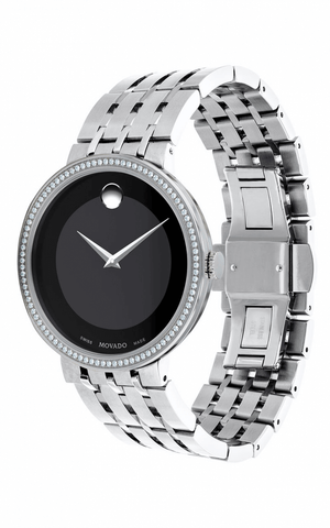 Stainless steel case with a stainless steel bracelet. Fixed stainless steel bezel set with 97 diamonds. Matte black dial with silver-tone dauphine-style hands. No markers. movado dot appears at the 12 o'clock position. Dial Type: Analog. Quartz movement. Scratch resistant sapphire crystal. Pull / push crown. Solid case back. Round case shape. Case size: 39 mm. Case thickness: 6.9 mm. Deployment clasp with a push button release. Water resistant at 30 meters / 100 feet. Functions: hour, minute. Additional Info: case set with 94-diamond bezel (0.367 t.c.w.). Dress watch style. Watch label: Swiss Made. Movado Esperanza Matte Black Dial Men's Diamond Watch 0607238.