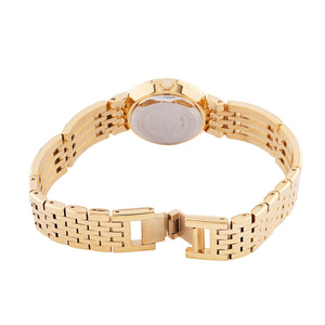 Yellow gold-tone stainless steel case and bracelet. Fixed yellow gold-tone bezel. Black dial with yellow gold-tone hands. No markers. The Movado dot appears at the 12 o'clock position. Dial Type: Analog. Quartz movement. Scratch resistant sapphire crystal. Pull / push crown. Solid case back. Round case shape. Case size: 26 mm. Case thickness: 6 mm. Band width: 14 mm. Band length: 7.75 inches. Jewelry clasp. Water resistant at 30 meters / 100 feet. Functions: hour, minute. Esperanza Series. Casual watch style. Watch label: Swiss Made. Movado Esperanza Quartz Black Dial Ladies Watch 0607149.