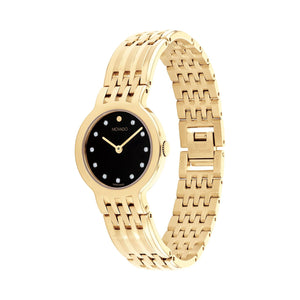 Contemporary, geometric lines pair perfectly with fluid, free falling links. Womens movado essence watch, 26mm yellow gold PVD finished case and link bracelet, black dial with diamond markers, sapphire crystal, Swiss quartz movement. Watre resistance up to 30 meters. Jewlery clasp.