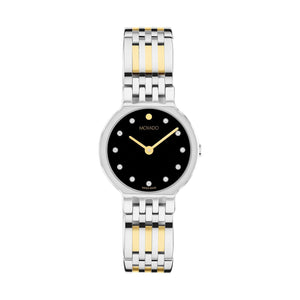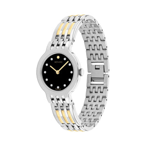 Contemporary, geometric lines pair perfectly with fluid, free falling links. Womens movado essence watch, 26mm stainless steel case and yellow gold PVD finished and stainless steel link bracelet, black museum dial, sapphire crystal, swiss quartz movement. Water resistance up to 30 meters. Jewlery clasp.