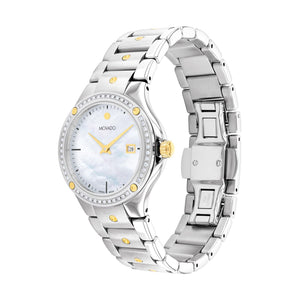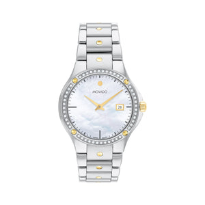 Women's Movado Excel, 32 mm Stainless Steel and bracelet, diamond set bezel, date window, sapphire crystal, Swiss Quartz movement. Water resistance up to 30 Meters. Deployment clasp.