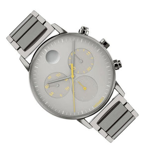 Movado face 43 mm mid grey ion plated stainless steel case and bracelet with a mid grey chronograph dial. dial grey museum with concave dot. Quartz movement. Case diameter 43mm. Water resestance up to 30 meters. K1 mineral crystal. push button with deployment clasp.